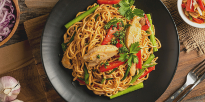 Menu: Kippensoep, Surinaamse bami met kip met als toetje cake met slagroom.